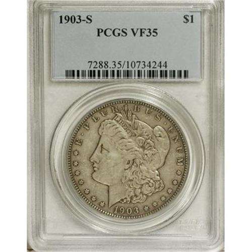 <B>1903-S $1 VF35 PCGS.</B></I> PCGS Population (92/995). NGC Census: (55/744). Mintage: 1,241,000. Numismedia Wsl. Price for NGC/PCGS coin in VF35: $266. (#7288)<BR><BR><b>Shipping:</b> Coins & Currency (<a target="_blank" href="http://www.heritageauctions.com/common/shipping.php">view shipping information</a>)