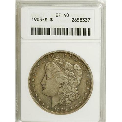<B>1903-S $1 XF40 ANACS.</B></I> NGC Census: (89/655). PCGS Population (123/872). Mintage: 1,241,000. Numismedia Wsl. Price for NGC/PCGS coin in XF40: $325. (#7288)<BR><BR><b>Shipping:</b> Coins & Currency (<a target="_blank" href="http://www.heritageauctions.com/common/shipping.php">view shipping information</a>)