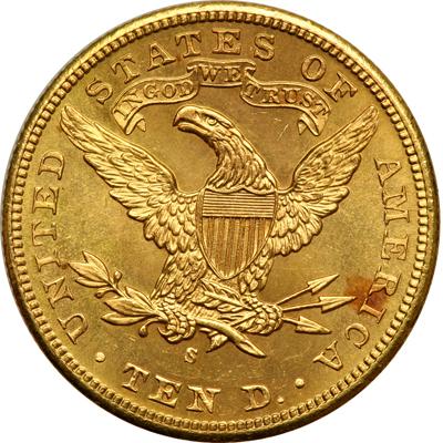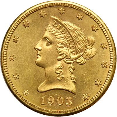 1903-S $10 Liberty. MS-60 Plus. Nice golden toning. Light hairlines over lustrous surfaces (PCGS # 8408).