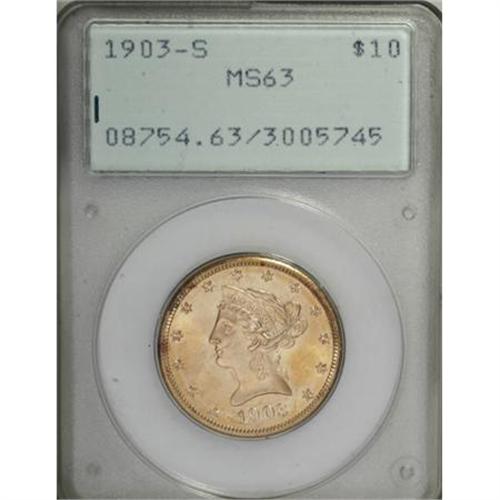 <B>1903-S $10 MS63 PCGS.</B></I> . PCGS Population (210/251). NGC Census: (172/327). Mintage: 538,000. Numismedia Wsl. Price for NGC/PCGS coin in MS63: $1,220. (#8754)<BR><BR><B>Coin Engraver:</B> Christian Gobrecht<BR><BR><b>Shipping:</b> Coins & Currency (<a target="_blank" href="http://www.heritageauctions.com/common/shipping.php">view shipping information</a>)