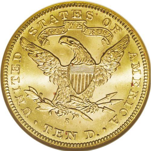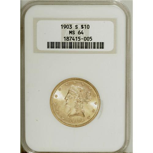 <B>1903-S $10 MS64 NGC.</B></I> A highly lustrous and meticulously struck near-Gem with nearly unmarked devices and carefully preserved fields. The reverse die is interesting for a network of mint-made die lines that criss-cross within the shield. Several faint die cracks reach the eagle's right (facing) wingtip. Housed in an older generation holder.<BR><BR><b>Shipping:</b> Coin/Currency (<a target="_blank" href="http://www.heritageauctions.com/common/shipping.php">view shipping information</a>)