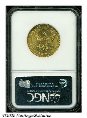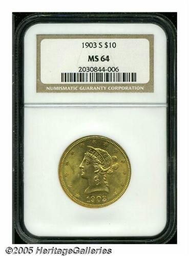 <B>1903-S<$10> MS64 NGC.</B></I> A lustrous and nicely struck peach-gold representative with obvious eye appeal. Die ejection marks on star 10 and a wispy slide mark on the chin are all that deny classification as a Gem.