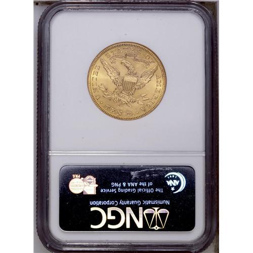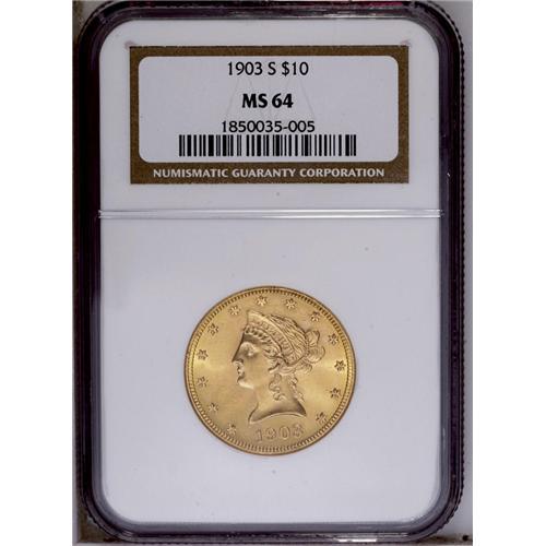 <B>1903-S<$10> MS64 NGC.</B></I> This coin possesses wonderful satin-like surfaces, full strike, and amazing eye appeal. This specimen would fit nicely into any premium gold coin enthusiast's collection. <BR><BR><B>Important notice:</B> Heritage usually auctions material at the rate of 200-250 lots per hour. On some occasions eBay Live bid software or the Internet may not be able to keep up with the pace of the auction. We recommend placing a realistic absentee bid now as insurance to avoid disappointment. Occasionally the auctioneer may eliminate or reject an eBay Live bid, and the auctioneer may also reopen a lot after the close of the eBay live bidding (usually because we missed an audience bid), and may reject your bid even if it shows you as the winning bidder. By bidding via eBay Live, you agree that Heritage may award the lot to another bidder at its sole discretion under the circumstances described above or any other reasonable circumstances. Since eBay bids are not shown to us until we open the lot on the floor, we treat those bids just like floor bids. In most cases the floor responds before the eBay bid is presented to us, due to Internet lag time, so for consistency we have made it a policy that floor bids are always considered first over tie eBay live bids. Also please note that all Heritage lots purchased through eBay Live carry a 20% Buyer's Premium. Please make sure you read the Terms and Conditions before you bid. This lot is being auctioned in conjunction with a live floor auction by Heritage Galleries & Auctioneers. All final auction and invoice information will be supplied by Heritage Galleries & Auctioneers, and all other information should be considered preliminary. Lot:4077 <BR><BR><B>Winning Notification and Billing:</B> After the FINAL session in this auction is complete, Heritage will send e-mail and snail mail invoices. This process normally takes several days. All final auction and invoice information will be supplied by Heritage Galleries & Auctioneers, and all other information should be considered preliminary. <BR><BR>This auction will be conducted on a live auction floor and over the Internet through eBay Live. If you choose to place an absentee bid, please take a moment to <font color='#0000ff'><u><a href='http://pages.ebay.com/liveauctions/help/before/laabsentee.html'>learn how eBay Live absentee bidding works</a></u></font><font color='#000000'>