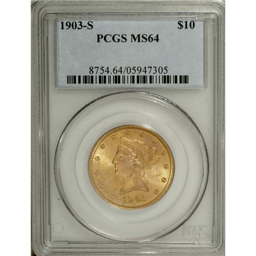 <B>1903-S $10 MS64 PCGS.</B></I> This intricately struck representative provides potent luster and features charming apple-green and apricot patina. The reverse is beautifully preserved, and the obverse field is only moderately abraded.<BR><BR><b>Shipping:</b> Coins & Currency (<a target="_blank" href="http://www.heritageauctions.com/common/shipping.php">view shipping information</a>)