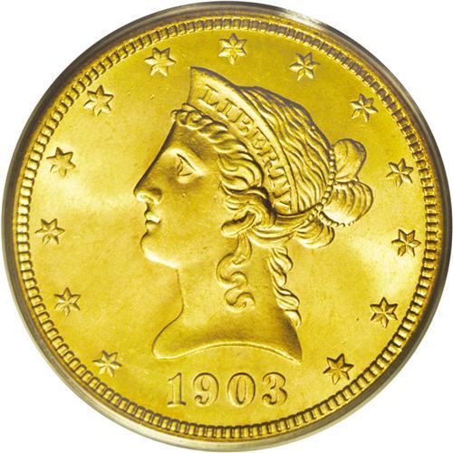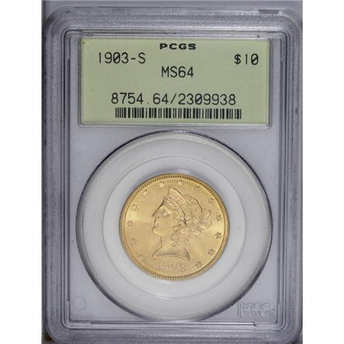 <B>1903-S<$10> MS64 PCGS.</B></I> This piece offers exemplary deep orange-gold surfaces on each side, with brilliant cartwheel luster and a sharp strike, save for a couple of the peripheral stars. A lovely near-Gem striking of this available issue, certified in a green-label holder.