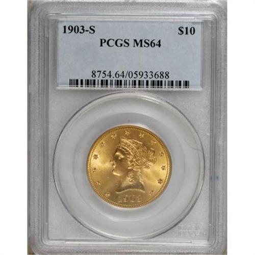 <B>1903-S $10 MS64 PCGS.</B></I> This lovely straw-gold near-Gem has potent luster and a penetrating strike. Marks are few and inconsequential. Among 20th century issues, less often seen than the 1901, 1901-S, and 1907.<BR><BR><b>Shipping:</b> Coins & Currency (<a target="_blank" href="http://www.heritageauctions.com/common/shipping.php">view shipping information</a>)