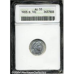 <B>1903-S<10C> AU55 ANACS.</B></I> Essentially untoned, bright surfaces reveal good luster in the areas adjacent to the design elements. Nicely struck, with no serious marks apparent. <BR><BR><B>Important notice:</B> Heritage usually auctions material at the rate of 200-250 lots per hour. On some occasions eBay Live bid software or the Internet may not be able to keep up with the pace of the auction. We recommend placing a realistic absentee bid now as insurance to avoid disappointment. Occasionally the auctioneer may eliminate or reject an eBay Live bid, and the auctioneer may also reopen a lot after the close of the eBay live bidding (usually because we missed an audience bid), and may reject your bid even if it shows you as the winning bidder. By bidding via eBay Live, you agree that Heritage may award the lot to another bidder at its sole discretion under the circumstances described above or any other reasonable circumstances. Since eBay bids are not shown to us until we open the lot on the floor, we treat those bids just like floor bids. In most cases the floor responds before the eBay bid is presented to us, due to Internet lag time, so for consistency we have made it a policy that floor bids are always considered first over tie eBay live bids. Also please note that all Heritage lots purchased through eBay Live carry a 20% Buyer's Premium. Please make sure you read the Terms and Conditions before you bid.