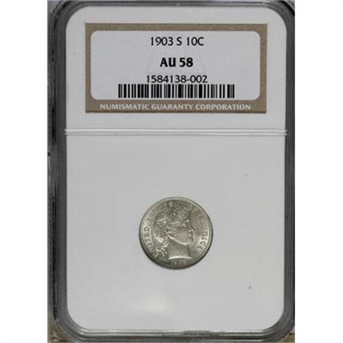 <B>1903-S 10C AU58 NGC.</B></I> . NGC Census: (5/27). PCGS Population (5/56). Mintage: 613,300. Numismedia Wsl. Price for NGC/PCGS coin in AU58: $885. (#4832)<BR><BR><B>Coin Engraver:</B> Charles E. Barber<BR><BR><b>Shipping:</b> Coins & Currency (<a target="_blank" href="http://www.heritageauctions.com/common/shipping.php">view shipping information</a>)