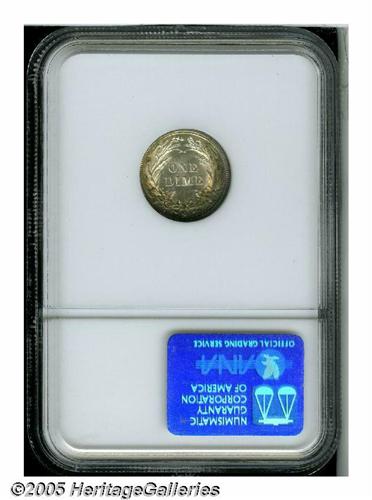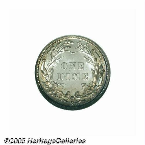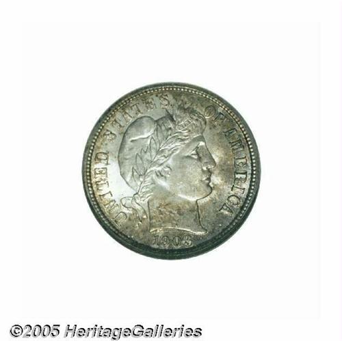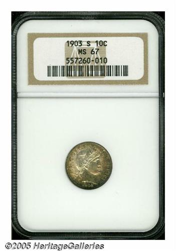 <B>1903-S<10C> MS67 NGC.</B></I> The '03-S is always in demand because of its absolute as well as condition rarity, due in large part from its mintage of only 613,300 pieces. Collectors have always prized this date in grades ranging from Good to Gem Uncirculated. This Superb piece, however, addresses an entirely different category, as it is tied with only two others (both services combined) as the finest known. The centers are a bright silver color with sparkling luster overall. Wide arcs at the peripheries exhibit rich multicolored iridescence on each side and lend a fully natural appearance. The surfaces are sharply struck and free from any troublesome abrasions. As a future pedigree identifier, a tiny contact mark is seen at the center of the M of DIME on the reverse. Population: 2 in 67, 0 finer (6/05).