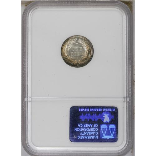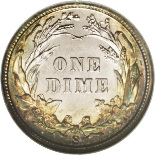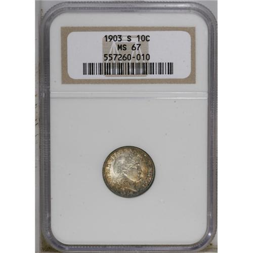 <B>1903-S<10C> MS67 NGC.</B></I> The '03-S is always in demand because of its absolute as well as condition rarity, due in large part from its mintage of only 613,300 pieces. The brilliant centers are bordered by rich peripheral arcs of multicolored iridescence, which lends a fully natural appearance. The surfaces are sharply struck and free from any troublesome abrasions. As a future pedigree identifier, a tiny contact mark is seen at the center of the M of DIME on the reverse. Population: 2 in 67, none finer (8/05).