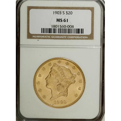 <B>1903-S $20 MS61 NGC.</B></I> A pale yellow-gold piece with plenty of flash and crisp detail. Though the fields and devices show a number of light marks, the overall eye appeal is significantly above-average for the grade.<BR><BR><B>Coin Engraver:</B> James B. Longacre<BR><BR><b>Shipping:</b> Coins & Currency (<a target="_blank" href="http://www.heritageauctions.com/common/shipping.php">view shipping information</a>)
