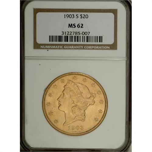 <B>1903-S $20 MS62 NGC.</B></I> NGC Census: (1954/1388). PCGS Population (1675/1520). Mintage: 954,000. Numismedia Wsl. Price for NGC/PCGS coin in MS62: $1,125. (#9044)<BR><BR><B>Coin Engraver:</B> James B. Longacre<BR><BR><b>Shipping:</b> Coins & Currency (<a target="_blank" href="http://www.heritageauctions.com/common/shipping.php">view shipping information</a>)