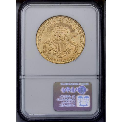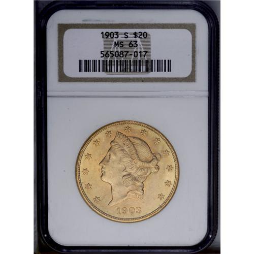 <B>1903-S<$20> MS63 NGC.</B></I> Attractive for the grade with smooth, satin-like luster and subtle color variances on both sides. The design elements are also pleasingly detailed and should have no trouble pleasing their next owner. <BR><BR><B>Important notice:</B> Heritage usually auctions material at the rate of 200-250 lots per hour. On some occasions eBay Live bid software or the Internet may not be able to keep up with the pace of the auction. We recommend placing a realistic absentee bid now as insurance to avoid disappointment. Occasionally the auctioneer may eliminate or reject an eBay Live bid, and the auctioneer may also reopen a lot after the close of the eBay live bidding (usually because we missed an audience bid), and may reject your bid even if it shows you as the winning bidder. By bidding via eBay Live, you agree that Heritage may award the lot to another bidder at its sole discretion under the circumstances described above or any other reasonable circumstances. Since eBay bids are not shown to us until we open the lot on the floor, we treat those bids just like floor bids. In most cases the floor responds before the eBay bid is presented to us, due to Internet lag time, so for consistency we have made it a policy that floor bids are always considered first over tie eBay live bids. Also please note that all Heritage lots purchased through eBay Live carry a 20% Buyer's Premium. Please make sure you read the Terms and Conditions before you bid. This lot is being auctioned in conjunction with a live floor auction by Heritage Galleries & Auctioneers. All final auction and invoice information will be supplied by Heritage Galleries & Auctioneers, and all other information should be considered preliminary. Lot:4419 <BR><BR><B>Winning Notification and Billing:</B> After the FINAL session in this auction is complete, Heritage will send e-mail and snail mail invoices. This process normally takes several days. All final auction and invoice information will be supplied by Heritage Galleries & Auctioneers, and all other information should be considered preliminary. <BR><BR>This auction will be conducted on a live auction floor and over the Internet through eBay Live. If you choose to place an absentee bid, please take a moment to <font color='#0000ff'><u><a href='http://pages.ebay.com/liveauctions/help/before/laabsentee.html'>learn how eBay Live absentee bidding works</a></u></font><font color='#000000'>