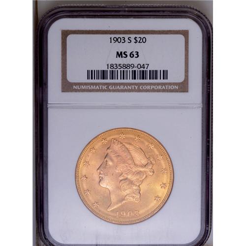 <B>1903-S<$20> MS63 NGC.</B></I> This branch mint twenty has strong, satiny luster and a bold strike. Scattered abrasions account for the grade.