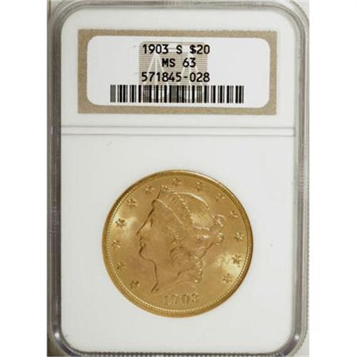 <B>1903-S $20 MS63 NGC.</B></I> NGC Census: (1096/268). PCGS Population (1141/343). Mintage: 954,000. Numismedia Wsl. Price for NGC/PCGS coin in MS63: $1,125. (#9044)<BR><BR><B>Coin Engraver:</B> James B. Longacre<BR><BR><b>Shipping:</b> Coins & Currency (<a target="_blank" href="http://www.heritageauctions.com/common/shipping.php">view shipping information</a>)