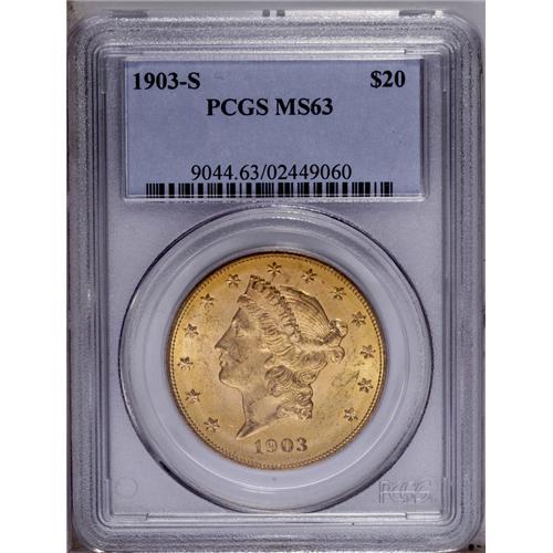 "1903-S $20 MS63 PCGS. A soft, satiny go"