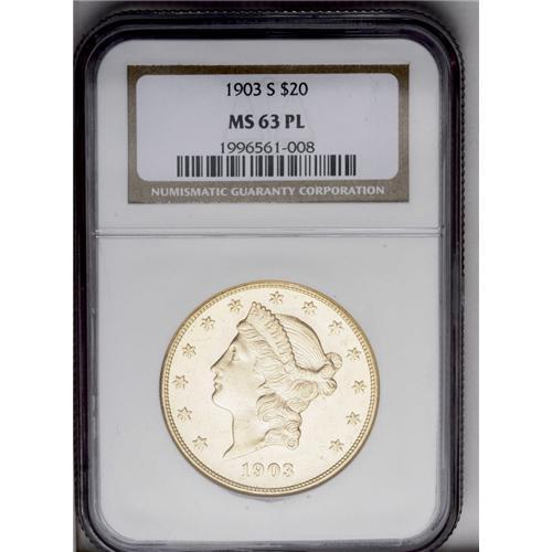 <B>1903-S<$20> MS63 Prooflike NGC.</B></I> This strongly reflective double eagle is crisply struck, and noticeable marks are limited to the S in PLURIBUS. NGC has certified only three 1903-S twenties as Prooflike, and the present piece is the single finest among that trio.