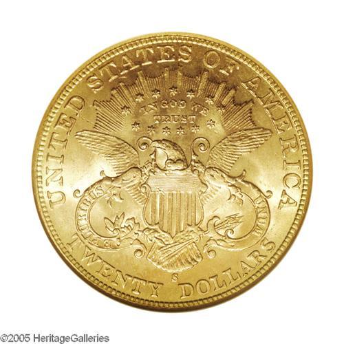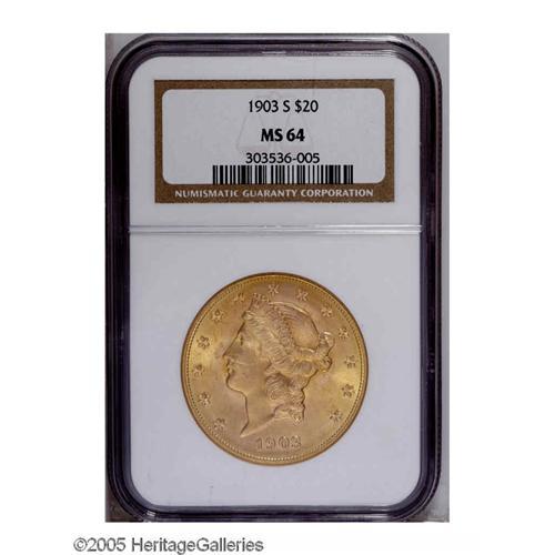 <B>1903-S<$20> MS64 NGC.</B></I> This S-mint issue is all but unobtainable above the present level. The lovely coin that we highlight here boasts scintillating mint luster and uncommonly smooth surfaces. Both sides are brightly colored in yellow-golden and orange-golden shades. Choice quality throughout. Census: 200 in 64, 19 finer (11/05).