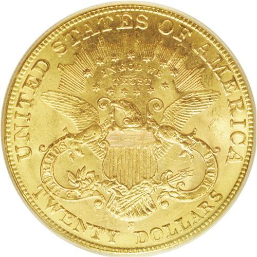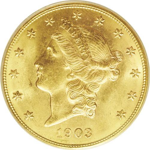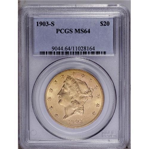 <B>1903-S<$20> MS64 PCGS.</B></I> Well struck except for selected parts of the eagle, with a pleasing bright sheen that emanates from both sides. Light orange-gold and greenish toning adorns the flashy surfaces. Nearly of Gem quality, save for a few wispy marks. The reverse legends are prominently strike doubled and tripled. Only a relative handful of this issue's nearly one million coins can lay claim to Choice Uncirculated grade status. <BR><BR><B>Important