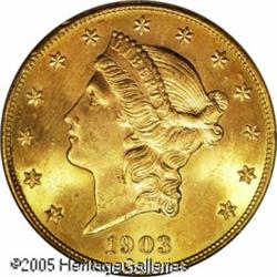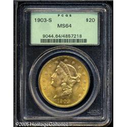 <B>1903-S $20 MS64 PCGS.</B></I> A frosty and bright coin that exhibits strong orange luster with the usual sharp strike. Scattered ticks from a Gem grade, but this coin is still far and away finer than most that are encountered of this date. We note a couple of reeding marks on Liberty's neck near her curl, and a thin scratch to the left of the 3 in the date to the rim. About as nice as this date can be obtained with just a few seen in higher grades. Population: 219 in 64, 5 finer (1/05). Lot:9331