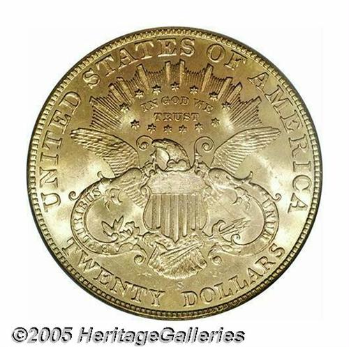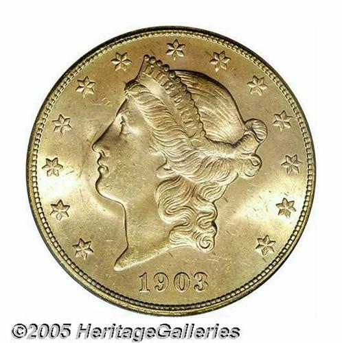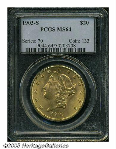 <B>1903-S<$20> MS64 PCGS.</B></I> Brilliant and lustrous. Most design features are sharp. Very pleasing from an aesthetic perspective, and largely free of the plethora of bagmarks which characterize the great majority of Uncirculated double eagles seen. Although the issue can't be characterized as rare in the MS60 to 63 grade range, only a small percentage of survivors can claim status at the MS64 level.