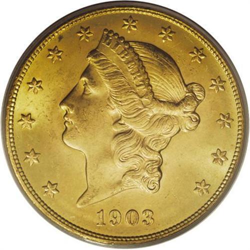 <B>1903-S $20 MS64 PCGS.</B></I> Peach-gold surfaces display a subtle greenish cast, and yield pleasing luster. The design features are well struck, including excellent definition in Liberty's hair, the star centers, and the eagle's plumage. A few minute contact marks prevent a higher grade. The 1903-S twenty is quite rare any finer.<BR><BR><b>Shipping:</b> Coins & Currency (<a target="_blank" href="http://www.heritageauctions.com/common/shipping.php">view shipping information</a>)