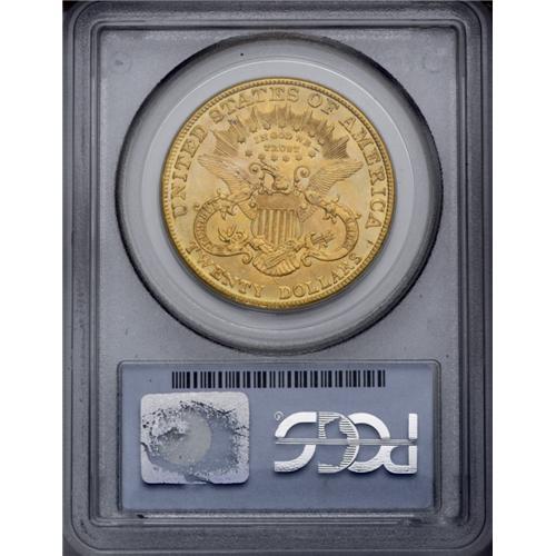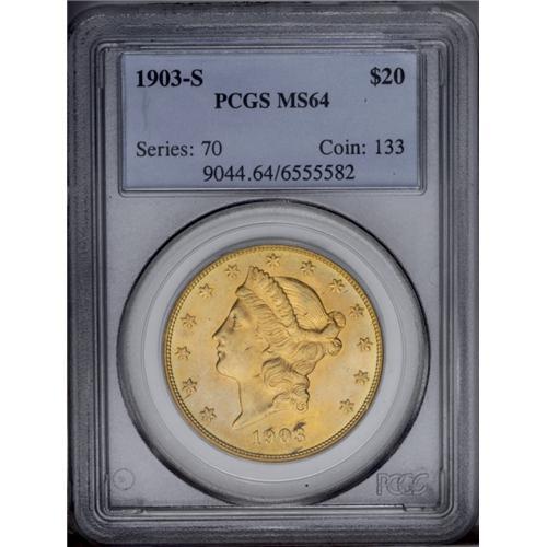 <B>1903-S<$20> MS64 PCGS.</B></I> Splendid orange, mint-green, and steel-gray toning covers both sides of this dynamically lustrous example. Nicely preserved overall, with a few small blemishes on the obverse that prevent an even higher grade assessment. <BR><BR><B>Important notice:</B> Heritage usually auctions material at the rate of 200-250 lots per hour. On some occasions eBay Live bid software or the Internet may not be able to keep up with the pace of the auction. We recommend placing a realistic absentee bid now as insurance to avoid disappointment. Occasionally the auctioneer may eliminate or reject an eBay Live bid, and the auctioneer may also reopen a lot after the close of the eBay live bidding (usually because we missed an audience bid), and may reject your bid even if it shows you as the winning bidder. By bidding via eBay Live, you agree that Heritage may award the lot to another bidder at its sole discretion under the circumstances described above or any other reasonable circumstances. Since eBay bids are not shown to us until we open the lot on the floor, we treat those bids just like floor bids. In most cases the floor responds before the eBay bid is presented to us, due to Internet lag time, so for consistency we have made it a policy that floor bids are always considered first over tie eBay live bids. Also please note that all Heritage lots purchased through eBay Live carry a 20% Buyer's Premium. Please make sure you read the Terms and Conditions before you bid. This lot is being auctioned in conjunction with a live floor auction by Heritage Galleries & Auctioneers. All final auction and invoice information will be supplied by Heritage Galleries & Auctioneers, and all other information should be considered preliminary. Lot:4423 <BR><BR><B>Winning Notification and Billing:</B> After the FINAL session in this auction is complete, Heritage will send e-mail and snail mail invoices. This process normally takes several days. All final auction and invoice information will be supplied by Heritage Galleries & Auctioneers, and all other information should be considered preliminary. <BR><BR>This auction will be conducted on a live auction floor and over the Internet through eBay Live. If you choose to place an absentee bid, please take a moment to <font color='#0000ff'><u><a href='http://pages.ebay.com/liveauctions/help/before/laabsentee.html'>learn how eBay Live absentee bidding works</a></u></font><font color='#000000'>