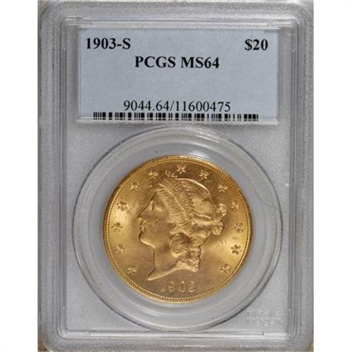 <B>1903-S $20 MS64 PCGS.</B></I> Fully struck and highly lustrous, this near-Gem double eagle displays attractive honey-gold toning; with rose highlights that are deeper and more noticeable on the reverse. Several faint grease streaks (as struck) are noted--one below 19 in the date, and couple more on the upper right reverse--which do not influence the technical grade of the piece. A few minor marks on Liberty's cheekbone and in the fields prevent a higher grade. PCGS has only graded eight examples of this issue finer (6/07). <BR><BR><b>Shipping:</b> Coins & Currency (<a target="_blank" href="http://www.heritageauctions.com/common/shipping.php">view shipping information</a>)