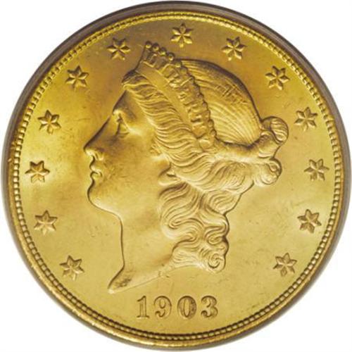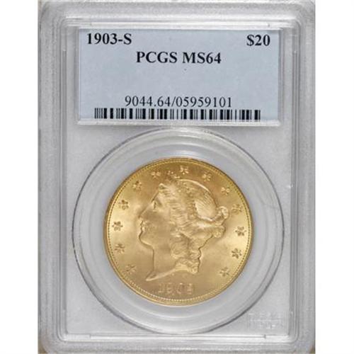<B>1903-S $20 MS64 PCGS.</B></I> This lovely 20th century double eagle is exquisitely struck with highly lustrous peach-gold surfaces that sport tinges of light green. A few minute obverse marks account for the grade. The 1903-S has a mintage of under a million pieces, compared to the over 5 million produced at that Mint the next year. PCGS has graded only eight finer representatives (8/07).<BR><BR><B>Coin Engraver:</B> James B. Longacre<BR><BR><b>Shipping:</b> Coins & Currency (<a target="_blank" href="http://www.heritageauctions.com/common/shipping.php">view shipping information</a>)