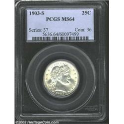 <TABLE cellSpacing=0 cellPadding=0 width="100%" bgColor=#000000 border=0><TBODY><TR><TD width="100%"><TABLE cellSpacing=1 cellPadding=3 width="100%" border=0><TBODY><TR><TD width="100%" bgColor=#79735c><FONT face=arial color=#ffffff size=3><B>Description</B> </FONT></TD></TR><TR><TD width="100%" bgColor=#ffffff><FONT face=arial size=2><B>1903-S 25C MS64 PCGS.</B></I> The 1903-S has a low mintage of just over a million pieces, and as a result it brings a premium in all grades. It is also conditionally scarce in Mint State with only 19 pieces having been so graded by PCGS and 17 finer (4/03). Sharply struck, the bright, lustrous surfaces show a slight bit of chatter on the face of Liberty, otherwise a very clean coin and sharply defined.<BR><I>From the Sunnywood Collection.</B></I> </FONT></TD></TR></TBODY></TABLE></TD></TR></TBODY></TABLE><BR><A name=PricesRealized></A><TABLE cellSpacing=0 cellPadding=0 width="100%" bgColor=#000000 border=0><TBODY><TR><TD width="100%"><TABLE cellSpacing=1 cellPadding=3 width="100%" border=0><TBODY><TR><TD width="100%" bgColor=#79735c><A name=PR><FONT face=arial color=#ffffff size=3><B>Previous Prices from Heritage Auctions</B> </FONT></A></TD></TR><TR><TD bgColor=#f6f6ed><TABLE cellSpacing=0 cellPadding=0 width="100%" border=1><TBODY><TR><TD align=middle width="33%"><B>Date</B></TD><TD align=middle width="33%"><B>Service</B></TD><TD align=middle width="33%"><B>Price</B></TD></TR><TR bgColor=whitesmoke><TD width="33%"><B>08/02/1997</B></TD><TD width="33%">PCGS</TD><TD width="33%">$1,265.00</TD></TR><TR bgColor=whitesmoke><TD width="33%"><B>01/08/1999</B></TD><TD width="33%">NGC</TD><TD width="33%">$1,265.00</TD></TR><TR bgColor=whitesmoke><TD width="33%"><B>06/01/2000</B></TD><TD width="33%">PCGS</TD><TD width="33%">$1,208.00</TD></TR><TR bgColor=whitesmoke><TD width="33%"><B>01/01/1995</B></TD><TD width="33%">NGC</TD><TD width="33%">$1,100.00</TD></TR></TBODY></TABLE></TD></TR><TR><TD bgColor=#ffffff><FONT face=arial size=1 ?>PLEASE NOTE: All prices realized reflect the final hammer price PLUS the buyer's premium in auctions that charge a buyer's premium. Each item has a notation at the top of the listing indicating whether that lot included a buyer's premium. Example: A item that sells with a final hammer price of $100 and a 20% buyer's premium will display with a price realized of $120. All information listed is intended to be as accurate as possible, but errors are possible. Please use this guide carefully and inform us of any inaccuracies. </FONT></TD></TR></TBODY></TABLE></TD></TR></TBODY></TABLE><BR><TABLE cellSpacing=0 cellPadding=0 width="100%" bgColor=#000000 border=0><TBODY><TR><TD width="100%"><TABLE cellSpacing=1 cellPadding=3 width="100%" border=0><TBODY><TR><TD width="100%" bgColor=#79735c colSpan=6><FONT face=arial color=#ffffff size=3><B>Price Guide*</B> </FONT></TD></TR><TR bgColor=#f6f6ed><TD align=middle><B>Grade</B> </TD><TD align=middle><B>Coin World<BR>(Trends)</B> </TD><TD align=middle><B>Numismedia<BR>Retail</B> </TD><TD align=middle><B>Numismedia<BR>Wholesale</B> </TD><TD align=middle><B>Coin<BR>Universe</B> </TD><TD align=middle><B>Heritage<BR>Value Index</B> </TD></TR><TR bgColor=#ffffff><TD align=middle>63</TD><TD align=right>$850.00</TD><TD align=right>$850.00</TD><TD align=right>$710.00</TD><TD align=right>$925.00</TD><TD align=right>$606.88</TD></TR><TR style="FONT-WEIGHT: bold" bgColor=#cccfdd><TD align=middle>64</TD><TD align=right>$1,385.00</TD><TD align=right>---</TD><TD align=right>$1,225.00</TD><TD align=right>$1,550.00</TD><TD align=right>$1,034.88</TD></TR><TR bgColor=#ffffff><TD align=middle>65</TD><TD align=right>$2,450.00</TD><TD align=right>---</TD><TD align=right>$2,175.00</TD><TD align=right>$2,750.00</TD><TD align=right>$2,000.00</TD></TR><TR bgColor=#ffffff><TD colSpan=6><FONT size=1>*All information listed is intended to be as accurate as possible, but errors are possible. No item may be returned or refused based on this information which is provided as a service to our customers. You should contact each pricing source directly to determine the accuracy of this information. </FONT></TD></TR></TBODY></TABLE></TD></TR></TBODY></TABLE><BR><TABLE cellSpacing=0 cellPadding=0 width="100%" bgColor=#000000 border=0><TBODY><TR><TD width="100%"><TABLE cellSpacing=1 cellPadding=3 width="100%" border=0><TBODY><TR><TD width="100%" bgColor=#79735c><FONT face=arial color=#ffffff size=3><B>Population Guide</B> </FONT></TD></TR><TR bgColor=#ffffff><TD align=middle><!-- Begin Output of Population Grid--><TABLE cellSpacing=0 cellPadding=0 width="100%" border=0><TBODY><TR><TD vAlign=center><TABLE cellSpacing=0 width="100%" border=1 cellsadding="3"><TBODY><TR><TD vAlign=center><TABLE cellSpacing=0 cellPadding=3 width="100%" border=1><TBODY><TR><TD vAlign=center align=middle bgColor=#f0f1e8 colSpan=2 <CENTER><FONT face=Arial size=2><B>PCGS Pop </B></FONT><CENTER></CENTER></TD><TD vAlign=center align=middle bgColor=#f0f1e8 colSpan=2><CENTER><FONT face=Arial size=2><B>NGC Pop</B></CENTER></FONT></TD></TR><TR><TD vAlign=center><FONT face=Arial size=2>(64)</FONT> </TD><TD vAlign=center align=right><FONT face=Arial size=2>20</FONT> </TD><TD vAlign=center><FONT face=Arial size=2>(64)</FONT> </TD><TD vAlign=center align=right><FONT face=Arial size=2>19</FONT> </TD></TR><TR><TD vAlign=center><FONT face=Arial size=2>(>64)</FONT> </TD><TD vAlign=center align=right><FONT face=Arial size=2>17</FONT> </TD><TD vAlign=center><FONT face=Arial size=2>(>64)</FONT> </TD><TD vAlign=center align=right><FONT face=Arial size=2>15</FONT> </TD></TR></TBODY></TABLE></TD></TR></TBODY></TABLE></TD></TR></TBODY></TABLE><!-- End Output of Population Grid--> Important notice: Heritage usually auctions material at the rate of 200-250 lots per hour. On some occasions eBay Live bid software or the Internet may not be able to keep up with the pace of the auction. We recommend placing a realistic absentee bid now as insurance to avoid disappointment. Occasionally t