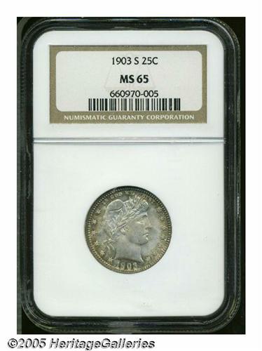 <B>1903-S<25C> MS65 NGC.</B></I> A delight to behold as the surfaces are excellent for the grade. Toned with light peripheral gold, while the centers are generally bright and frosty. Sharply struck for this issue, with no signs of weakness on the lower reverse. Decidedly scarce this nice, and downright rare appreciably finer. Population: 11 in 65, 3 finer (6/05).