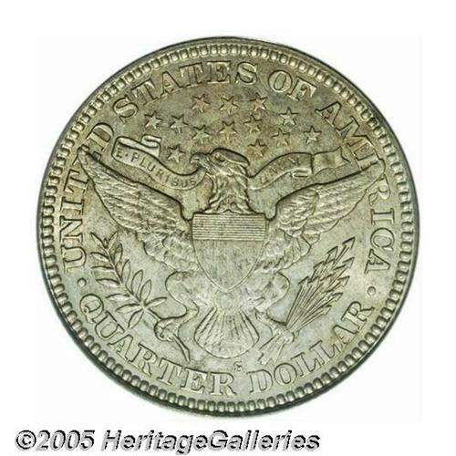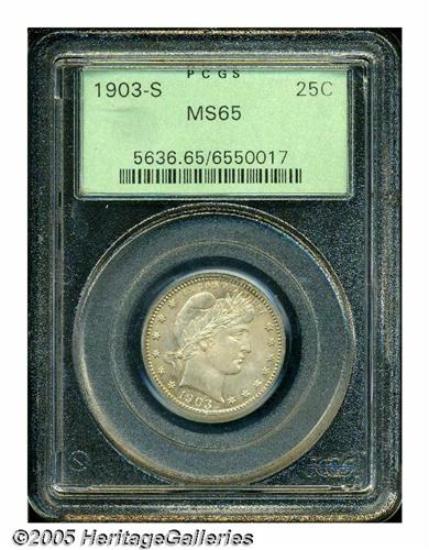 <B>1903-S<25C> MS65 PCGS.</B></I> Typically sharp beneath a uniform coating of milky golden-gray patina. The lower mintage 1903-S, one of just over 1 million pieces struck, is a scarce and sought-after issue in grades of Fine or better. Gems, of course, are an elusive and highly prized item. Population: 11 in 65, 9 finer (4/05).