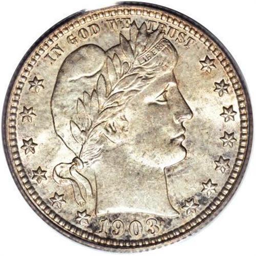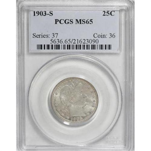 <B>1903-S 25C MS65 PCGS.</B></I> Mottled steel-gray toning on the obverse cedes to glints of gold on the reverse of this nice Gem piece, an example of this low-mintage midseries S-mint issue. This coin offers a great strike, but a scrape in the center shield requires mention. Population: 12 in 65, 10 finer (1/08).<BR><I>From The Southwest Collection.</B></I><BR><BR><B>Coin Engraver:</B> Charles E. Barber<BR><BR><b>Shipping:</b> Coins & Currency (<a target="_blank" href="http://www.heritageauctions.com/common/shipping.php">view shipping information</a>)
