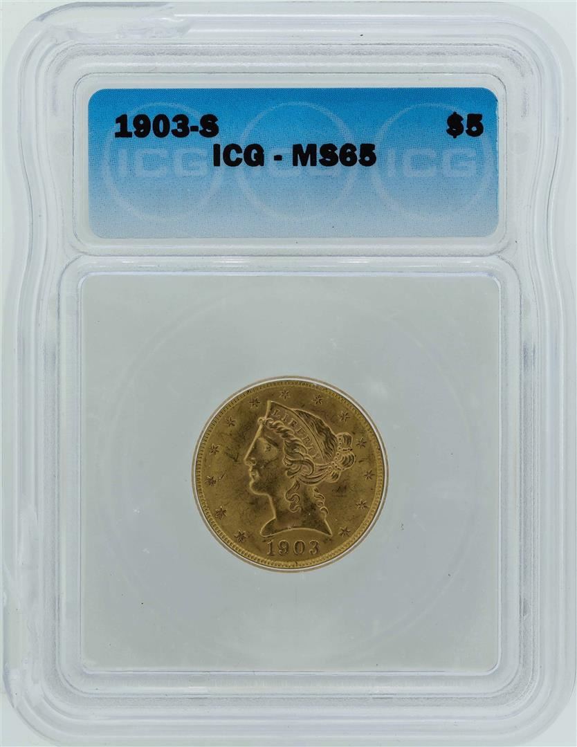 One 1903-S $5 Liberty Head Half Eagle Gold Coin ICG MS65. ICG Certified.