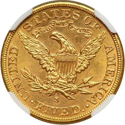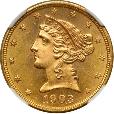 1903-S $5 Liberty. NGC graded MS-64. The otherwise bright golden color has semi-reflective shadings in a few areas on this very choice example. Struck with exactness throughout on the main devices. In a new NGC 4 pronged holder (PCGS # 8408).