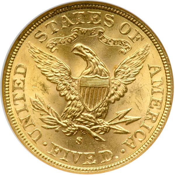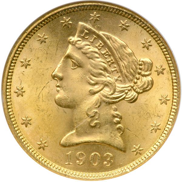 1903-S $5 Liberty. NGC graded MS-65. An untoned gem. The golden, mint-fresh originality, as crisp and glossy as when it was first released from to the Treasury for distribution, offers endless visual impact for the buyer of Gem quality United States gold. Pop 227; 58 finer (PCGS # 8408) .