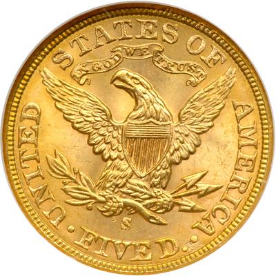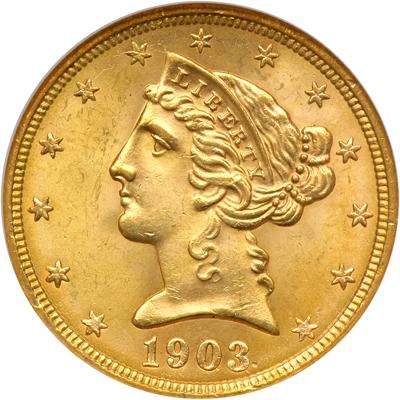 1903-S $5 Liberty. NGC graded MS-65. A nice frosty coin. A radiant Gem inside and out, and fully struck with vibrant gold color that rises and falls in an almost rhythmic display. Devices were struck with the primary energy required to impart the design to the outer areas as well as enough vigor by the dies to impart clear-cut centers. This is a well-known trait of San Francisco mint half eagles of the early 20th century. Pop 217; 61 finer; 53 in 66; 8 in 67. (PCGS # 8408).