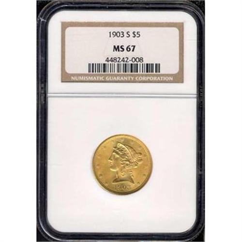 <b>1903-S $5 Liberty. NGC graded MS67.</b> A better post-1900 half eagle in this superlative condition, the 1903-S can always be counted on for superior luster and strong strike detail at the main devices, and so it is here. Sharply struck throughout, the frosty mint luster that spreads over each side shows a light overlay of reddish color that is most appealing. The bright, flashy surfaces are not only well preserved but spectacularly so. An outstanding example, one of the finest ever certified! NGC Pop: 7, with 0 higher (4/06).