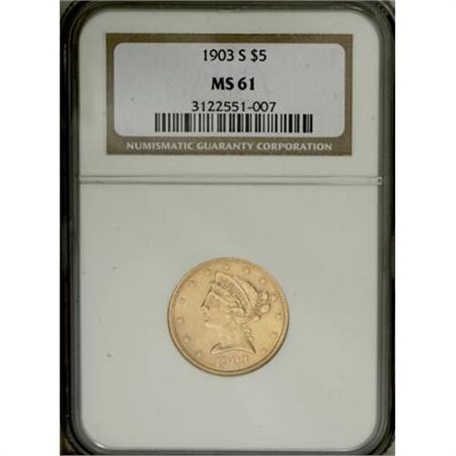 <B>1903-S $5 MS61 NGC.</B></I> NGC Census: (503/2375). PCGS Population (357/2227). Mintage: 1,855,000. Numismedia Wsl. Price for NGC/PCGS coin in MS61: $290. (#8408)<BR><BR><B>Coin Engraver:</B> Christian Gobrecht<BR><BR><b>Shipping:</b> Coins & Currency (<a target="_blank" href="http://www.heritageauctions.com/common/shipping.php">view shipping information</a>)