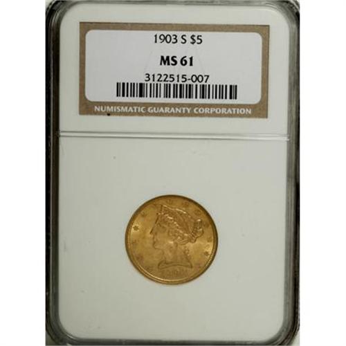 <B>1903-S $5 MS61 NGC.</B></I> NGC Census: (503/2375). PCGS Population (357/2226). Mintage: 1,855,000. Numismedia Wsl. Price for NGC/PCGS coin in MS61: $290. (#8408)<BR><BR><B>Coin Engraver:</B> Christian Gobrecht<BR><BR><b>Shipping:</b> Coins & Currency (<a target="_blank" href="http://www.heritageauctions.com/common/shipping.php">view shipping information</a>)