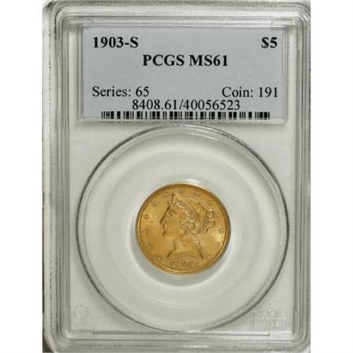 <B>1903-S $5 MS61 PCGS.</B></I> PCGS Population (357/2229). NGC Census: (507/2394). Mintage: 1,855,000. Numismedia Wsl. Price for NGC/PCGS coin in MS61: $290. (#8408)<BR><BR><B>Coin Engraver:</B> Christian Gobrecht<BR><BR><b>Shipping:</b> Coins & Currency (<a target="_blank" href="http://www.heritageauctions.com/common/shipping.php">view shipping information</a>)