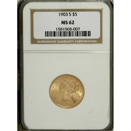 <B>1903-S $5 MS62 NGC.</B></I> NGC Census: (827/1512). PCGS Population (722/1480). Mintage: 1,855,000. Numismedia Wsl. Price for NGC/PCGS coin in MS62: $310. (#8408)<BR><BR><B>Coin Engraver:</B> Christian Gobrecht<BR><BR><b>Shipping:</b> Coins & Currency (<a target="_blank" href="http://www.heritageauctions.com/common/shipping.php">view shipping information</a>)