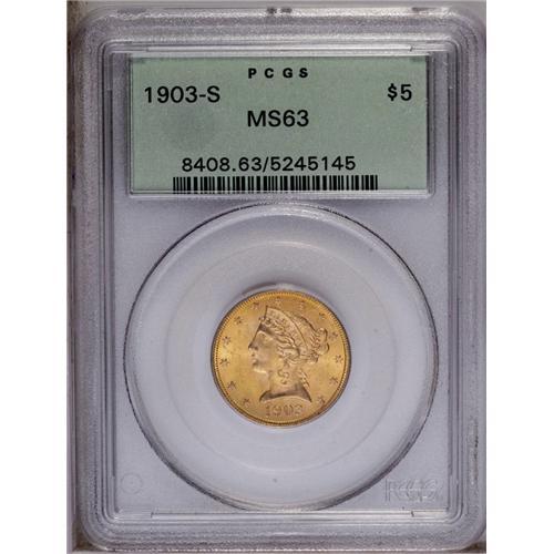 1903-S $5 MS63 PCGS. An orange-red half eagle with lus 1903-S[$5] MS63 PCGS.
