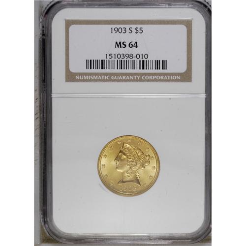 <B>1903-S $5 MS64 NGC.</B></I> Choice and crisply struck with strong luster. The rose-tinged yellow-gold surfaces have small, scattered marks that account for the grade.<BR><BR><b>Shipping:</b> Coin/Currency (<a target="_blank" href="http://www.heritageauctions.com/common/shipping.php">view shipping information</a>)