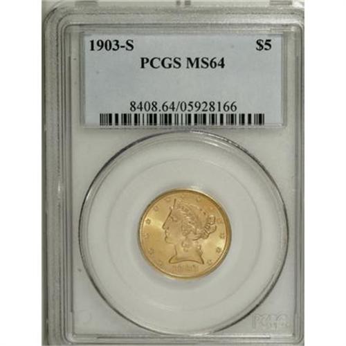 <B>1903-S $5 MS64 PCGS.</B></I> Decisively struck in the centers with vibrant luster and surprisingly smooth wheat-gold surfaces. An attractive representative of this early 20th century issue, one popular with type collectors.<BR><BR><B>Coin Engraver:</B> Christian Gobrecht<BR><BR><b>Shipping:</b> Coins & Currency (<a target="_blank" href="http://www.heritageauctions.com/common/shipping.php">view shipping information</a>\)