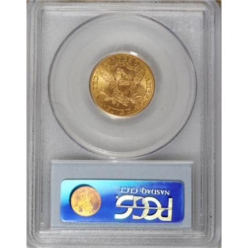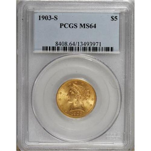 <B>1903-S $5 MS64 PCGS.</B></I> A decisively struck and shining peach-gold and yellow-gold representative of this S-mint issue, carefully preserved with only pinpoint marks. This piece has excellent visual appeal for the grade.<BR><BR><B>Coin Engraver:</B> Christian Gobrecht<BR><BR><b>Shipping:</b> Coins & Currency (<a target="_blank" href="http://www.heritageauctions.com/common/shipping.php">view shipping information</a>)