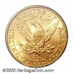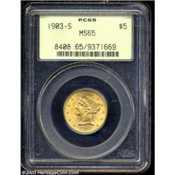 <table><tr><td><TABLE cellSpacing=0 cellPadding=0 width="100%" bgColor=#000000 border=0><TBODY> <TR><TD width="100%"><TABLE cellSpacing=1 cellPadding=3 width="100%" border=0><TBODY><TR><TD width="100%" bgColor=#79735c><FONT face=arial color=#ffffff size=3><B>Description</B> </FONT></TD></TR><TR><TD width="100%" bgColor=#ffffff><FONT face=arial size=2><B>1903-S $5 MS65 PCGS.</B></I> Bright, well preserved surfaces with radiant, frosty luster. Pinpoint striking details are seen near the center of each side, with a few weak peripheral stars, as is generally seen on this issue. An outstanding Liberty eagle, and conditionally scarce as a Gem. Population: 74 in 65, 12 finer (10/03). </FONT></TD></TR></TBODY></TABLE></TD></TR></TBODY></TABLE><BR><A name=PricesRealized></A><TABLE cellSpacing=0 cellPadding=0 width="100%" bgColor=#000000 border=0><TBODY><TR><TD width="100%"><TABLE cellSpacing=1 cellPadding=3 width="100%" border=0><TBODY><TR><TD width="100%" bgColor=#79735c><A name=PR><FONT face=arial color=#ffffff size=3><B>Previous Prices from Heritage Auctions</B> </FONT></A></TD></TR><TR><TD bgColor=#f6f6ed><TABLE cellSpacing=0 cellPadding=0 width="100%" border=1><TBODY><TR><TD align=middle width="33%"><B>Date</B></TD><TD align=middle width="33%"><B>Service</B></TD><TD align=middle width="33%"><B>Price</B></TD></TR><TR bgColor=whitesmoke><TD width="33%"><B>11/12/2002</B></TD><TD width="33%">PCGS</TD><TD width="33%">$2,472.50</TD></TR><TR bgColor=whitesmoke><TD width="33%"><B>06/10/2000</B></TD><TD width="33%">PCGS</TD><TD width="33%">$2,070.00</TD></TR><TR bgColor=whitesmoke><TD width="33%"><B>06/06/1997</B></TD><TD width="33%">NGC</TD><TD width="33%">$4,600.00</TD></TR><TR bgColor=whitesmoke><TD width="33%"><B>04/01/2001</B></TD><TD width="33%">PCGS</TD><TD width="33%">$2,070.00</TD></TR><TR bgColor=whitesmoke><TD width="33%"><B>02/01/2001</B></TD><TD width="33%">NGC</TD><TD width="33%">$2,300.00</TD></TR><TR bgColor=whitesmoke><TD width="33%"><B>09/01/1999</B></TD><TD width="33%">NGC</TD><TD width="33%">$4,140.00</TD></TR></TBODY></TABLE></TD></TR><TR><TD bgColor=#ffffff><FONT face=arial size=1 ?>PLEASE NOTE: All prices realized reflect the final hammer price PLUS the buyer's premium in auctions that charge a buyer's premium. Each item has a notation at the top of the listing indicating whether that lot included a buyer's premium. Example: A item that sells with a final hammer price of $100 and a 20% buyer's premium will display with a price realized of $120. All information listed is intended to be as accurate as possible, but errors are possible. Please use this guide carefully and inform us of any inaccuracies. </FONT></TD></TR></TBODY></TABLE></TD></TR></TBODY></TABLE><BR><TABLE cellSpacing=0 cellPadding=0 width="100%" bgColor=#000000 border=0><TBODY><TR><TD width="100%"><TABLE cellSpacing=1 cellPadding=3 width="100%" border=0><TBODY><TR><TD width="100%" bgColor=#79735c colSpan=6><FONT face=arial color=#ffffff size=3><B>Price Guide*</B> </FONT></TD></TR><TR bgColor=#f6f6ed><TD align=middle><B>Grade</B> </TD><TD align=middle><B>Coin World<BR>(Trends)</B> </TD><TD align=middle><B>Numismedia<BR>Retail</B> </TD><TD align=middle><B>Numismedia<BR>Wholesale</B> </TD><TD align=middle><B>Coin<BR>Universe</B> </TD><TD align=middle><B>Heritage<BR>Value Index</B> </TD></TR><TR bgColor=#ffffff><TD align=middle>64</TD><TD align=right>$1,000.00</TD><TD align=right>---</TD><TD align=right>$835.00</TD><TD align=right>$1,000.00</TD><TD align=right>$744.63</TD></TR><TR style="FONT-WEIGHT: bold" bgColor=#cccfdd><TD align=middle>65</TD><TD align=right>---</TD><TD align=right>---</TD><TD align=right>$2,275.00</TD><TD align=right>$3,250.00</TD><TD align=right>$2,718.33</TD></TR><TR bgColor=#ffffff><TD align=middle>66</TD><TD align=right>---</TD><TD align=right>---</TD><TD align=right>$5,100.00</TD><TD align=right>$7,000.00</TD><TD align=right>$5,169.17</TD></TR><TR bgColor=#ffffff><TD colSpan=6><FONT size=1>*All information listed is intended to be as accurate as possible, but errors are possible. No item may be returned or refused based on this information which is provided as a service to our customers. You should contact each pricing source directly to determine the accuracy of this information. </FONT></TD></TR></TBODY></TABLE></TD></TR></TBODY></TABLE><BR><TABLE cellSpacing=0 cellPadding=0 width="100%" bgColor=#000000 border=0><TBODY><TR><TD width="100%"><TABLE cellSpacing=1 cellPadding=3 width="100%" border=0><TBODY><TR><TD width="100%" bgColor=#79735c><FONT face=arial color=#ffffff size=3><B>Population Guide</B> </FONT></TD></TR><TR bgColor=#ffffff><TD align=middle><!-- Begin Output of Population Grid--><TABLE cellSpacing=0 cellPadding=0 width="100%" border=0><TBODY><TR><TD vAlign=center><TABLE cellSpacing=0 width="100%" border=1 cellsadding="3"><TBODY><TR><TD vAlign=center><TABLE cellSpacing=0 cellPadding=3 width="100%" border=1><TBODY><TR><TD vAlign=center align=middle bgColor=#f0f1e8 colSpan=2 <CENTER><FONT face=Arial size=2><B>PCGS Pop </B></FONT><CENTER></CENTER></TD><TD vAlign=center align=middle bgColor=#f0f1e8 colSpan=2><CENTER><FONT face=Arial size=2><B>NGC Pop</B></CENTER></FONT></TD></TR><TR><TD vAlign=center><FONT face=Arial size=2>(65)</FONT> </TD><TD vAlign=center align=right><FONT face=Arial size=2>74</FONT> </TD><TD vAlign=center><FONT face=Arial size=2>(65)</FONT> </TD><TD vAlign=center align=right><FONT face=Arial size=2>142</FONT> </TD></TR><TR><TD vAlign=center><FONT face=Arial size=2>(>65)</FONT> </TD><TD vAlign=center align=right><FONT face=Arial size=2>12</FONT> </TD><TD vAlign=center><FONT face=Arial size=2>(>65)</FONT> </TD><TD vAlign=center align=right><FONT face=Arial size=2>29</FONT> </TD></TR></TBODY></TABLE></TD></TR></TBODY></TABLE></TD></TR></TBODY></TABLE><!-- End Output of Population Grid--></TD></TR></TBODY></TABLE></TD></TR></TBODY></TABLE><BR><TABLE cellSpacing=0 cellPadding=0 width="100%" bgColor=#000000 border=0><TBODY><TR> Important notice: Heritage usually auction