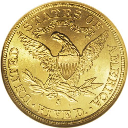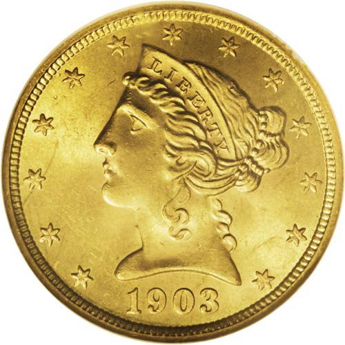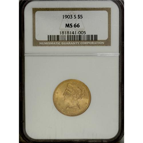 <B>1903-S $5 MS66 NGC.</B></I> This pinpoint-sharp and thoroughly lustrous Liberty gold type coin has a well preserved reverse and only minimal obverse grazes. A trace of translucent residue beneath the left (facing) wing is noted, but the eye appeal is formidable. Census: 49 in 66, 7 finer (11/06).<BR><BR><b>Shipping:</b> Coin/Currency (<a target="_blank" href="http://www.heritageauctions.com/common/shipping.php">view shipping information</a>)