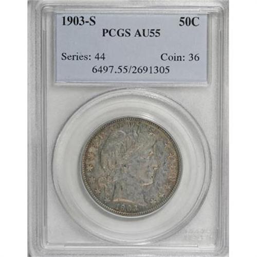 <B>1903-S 50C AU55 PCGS.</B></I> PCGS Population (3/65). NGC Census: (0/53). Mintage: 1,920,772. Numismedia Wsl. Price for NGC/PCGS coin in AU55: $350. (#6497)<BR><BR><B>Coin Engraver:</B> Charles E. Barber<BR><BR><b>Shipping:</b> Coins & Currency (<a target="_blank" href="http://www.heritageauctions.com/common/shipping.php">view shipping information</a>)