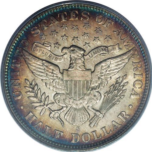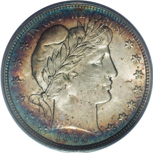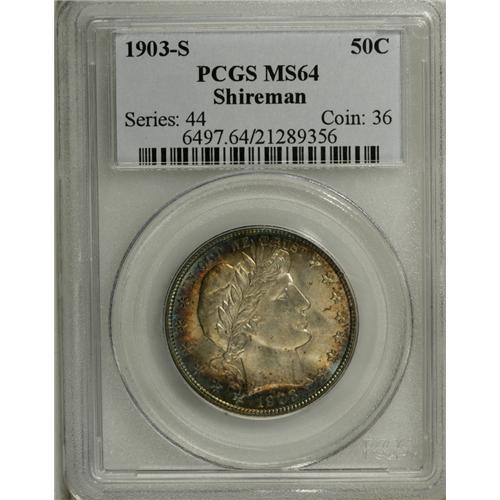 <B>1903-S 50C MS64 PCGS.</B></I> Ex: Shireman. Boasting outstanding visual appeal, this near-Gem representative exhibits frosty-white centers dramatically framed in deep, iridescent shades of russet and blue. Only a trio of hairline scratches on Liberty's neck limits the grade. Population: 19 in 64, 12 finer (12/06).<BR><BR><b>Shipping:</b> Coin/Currency (<a target="_blank" href="http://www.heritageauctions.com/common/shipping.php">view shipping information</a>)